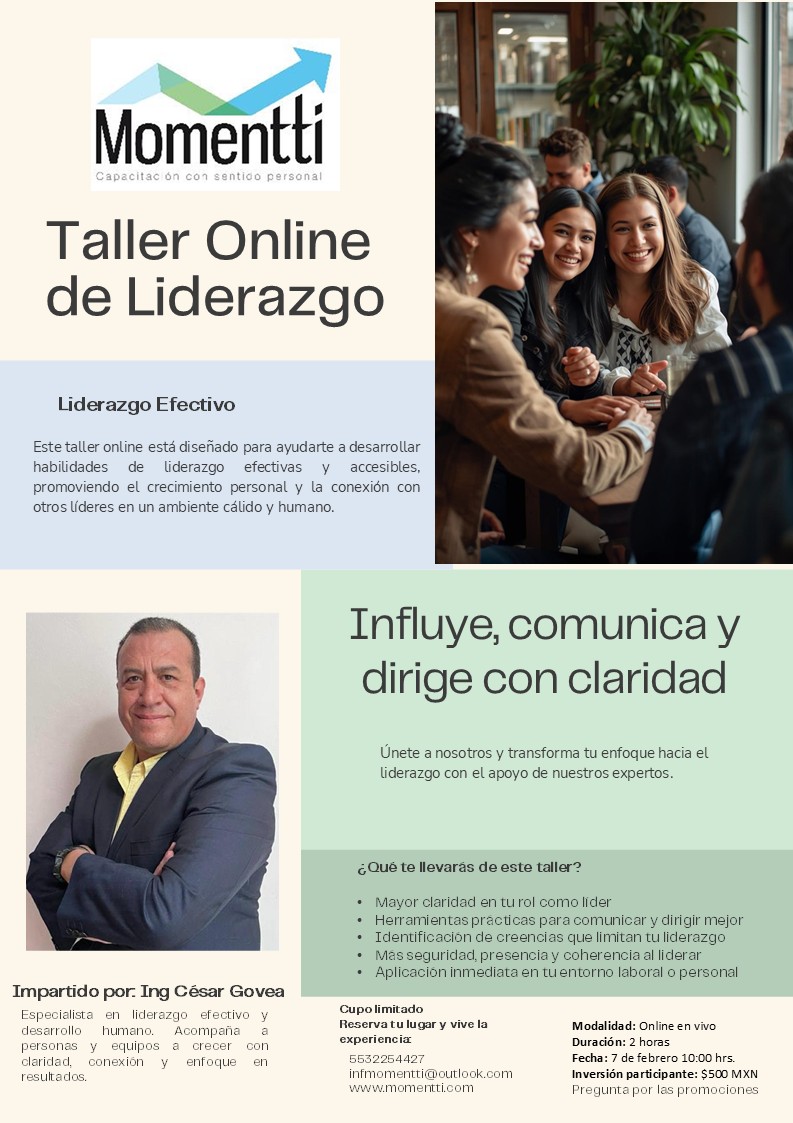 Este workshop intensivo te proporcionará las herramientas necesarias para convertirte en un líder más efectivo y carismático en tu área profesional.